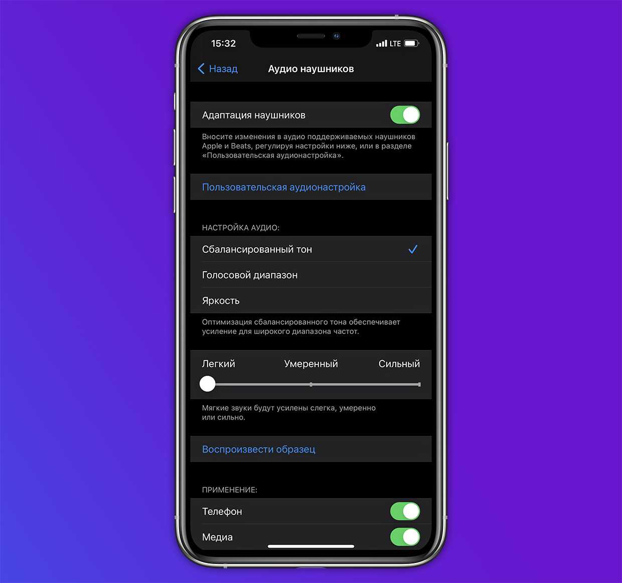 Здесь есть три варианта звучания: сбалансированный тон, голосовой диапазон и Яркость. Также можно персонально откалибровать наушники, пройдя пятиминутный тест с примерами звуков.