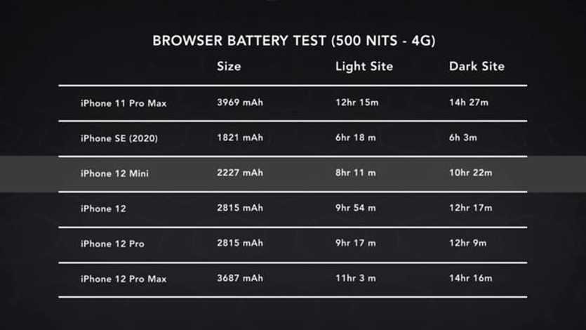 По рунету гуляет картинка с тестом автономности нескольких айфонов с режиме использования браузера через мобильный интернет 4G. Мне не удалось найти первоисточник эти данных, поэтому прошу отнестись к этой таблице с умеренной долей недоверия.