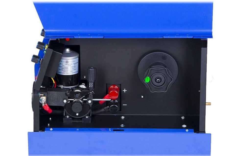 Катушка с автоматическим приводом расположена в верхней задней части корпуса. Предусмотрена плавная регулировка прижатия и подачи проволоки, первый регулятор размещен внутри корпуса, второй на лицевой панели управления.