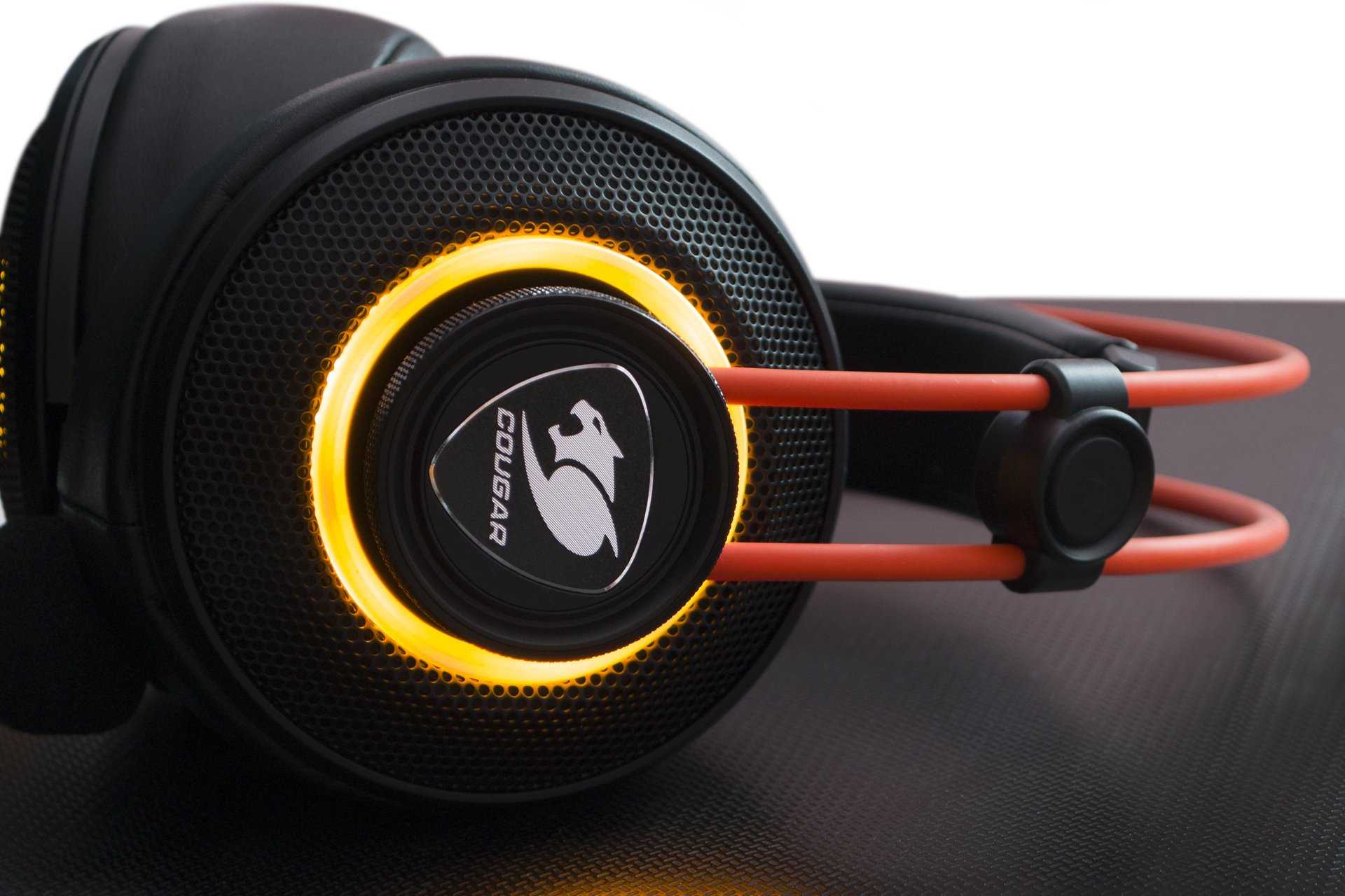 Чаши выполнены из прочного матового черного пластика. С внешней стороны каждого динамика располагается мелкая черная металлическая сеточка. В центральной части чаши закреплена круглая пластиковая площадка с логотипом компании Cougar. Соединяющие провода чаш имеют форму узкого черного шлейфа, что практически исключает надлом или повреждение во времяэксплуатации.