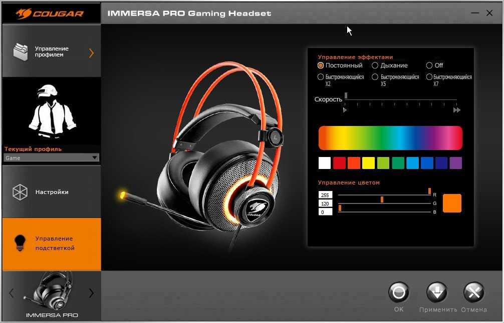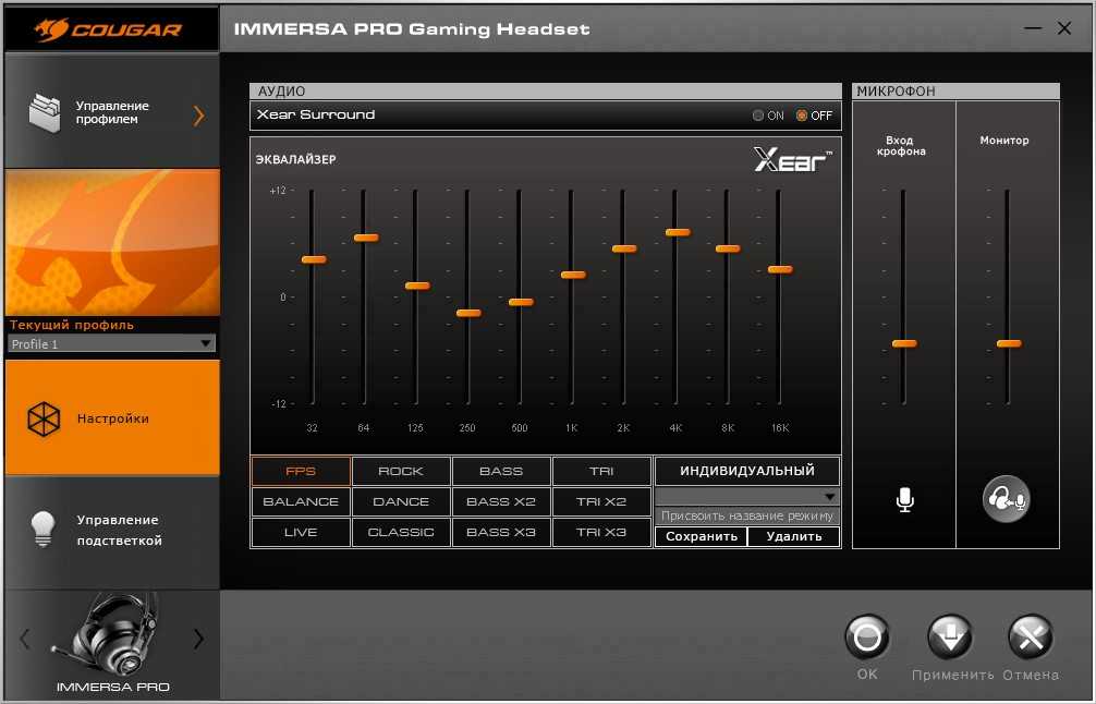 Управление и тонкая настройка гарнитуры производится через фирменное программное обеспечение Cougar UIX system. Это универсальная платформа для устройств Cougar, позволяющая проводить настройки всей периферии в одном программном продукте. Интерфейс приложения интуитивно понятен.