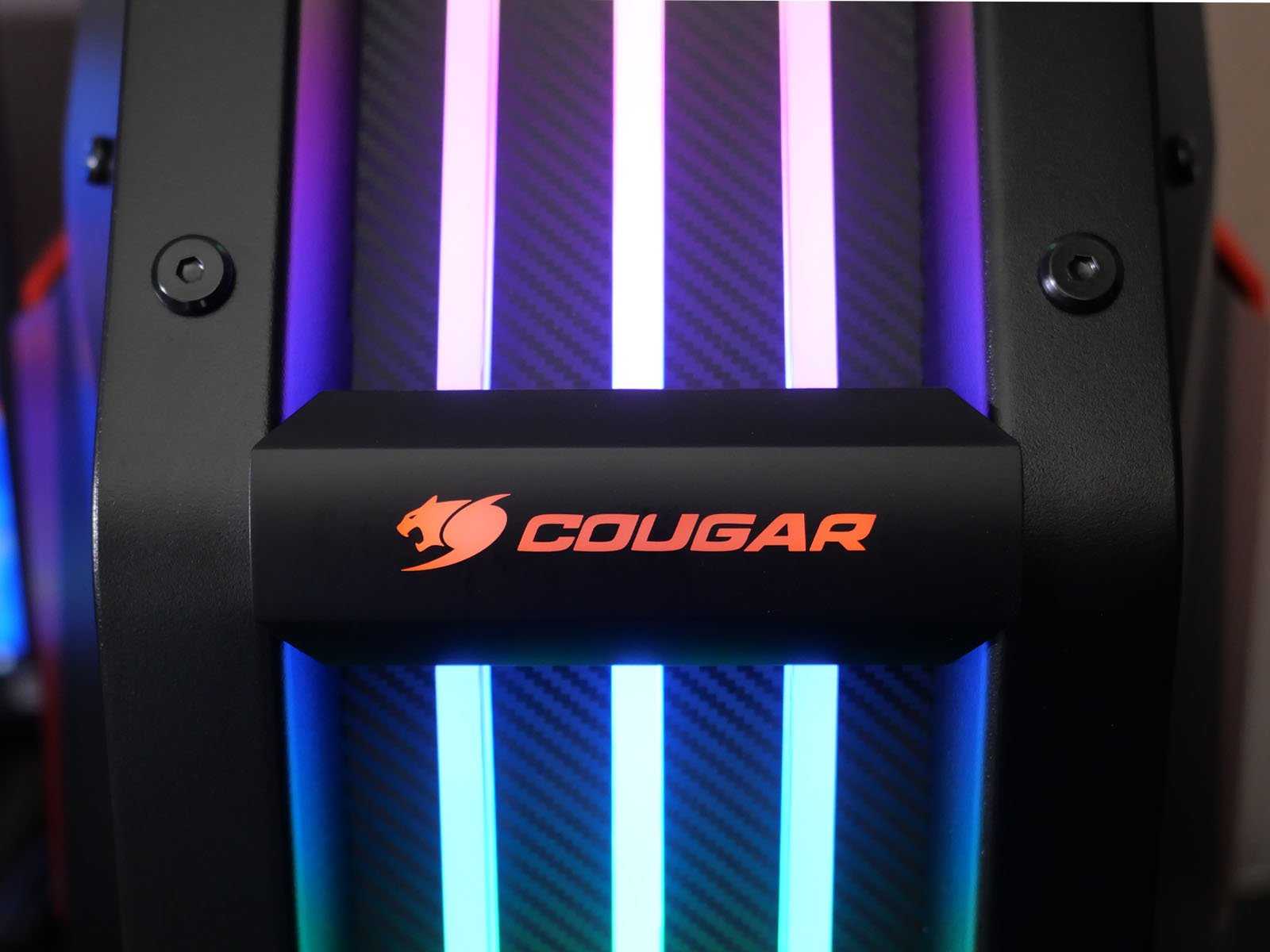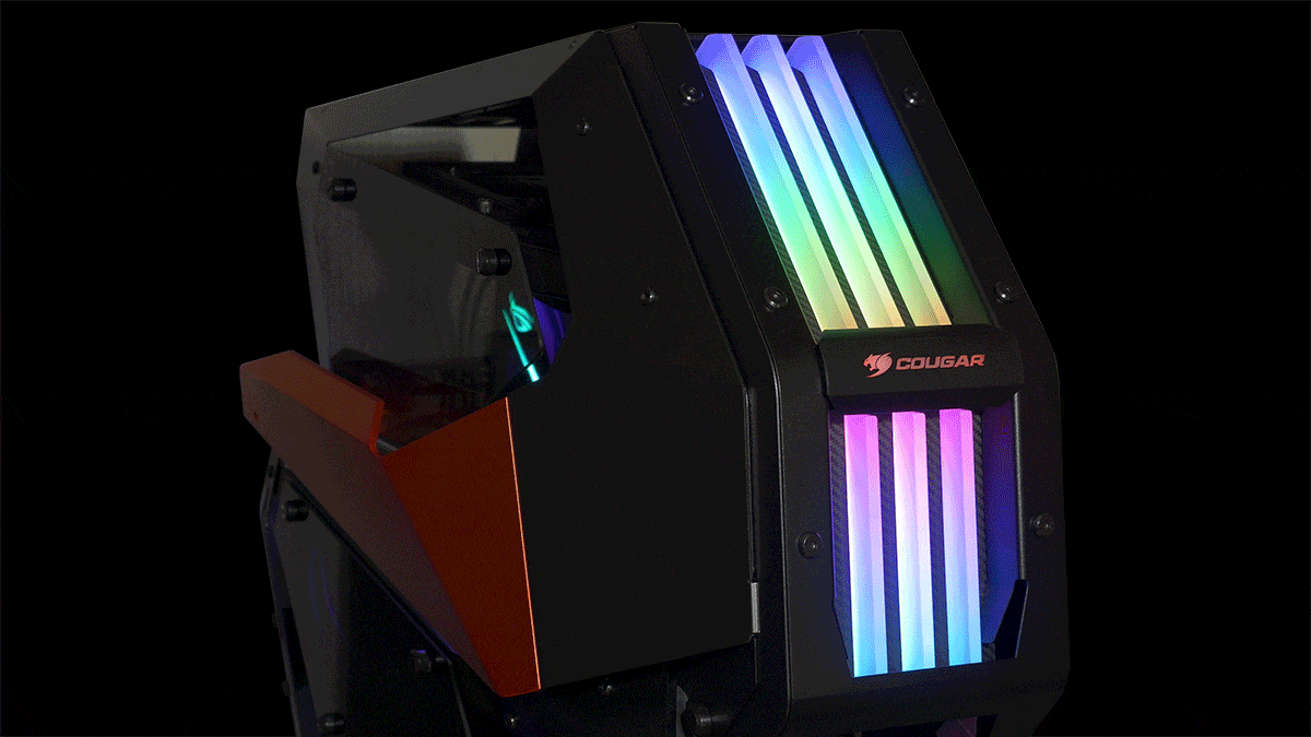 Благодаря крупным подсвечиваемым элементам, фронтальная панель — несомненно один из самых ярких элементов корпуса Cougar Conquer 2. Три полупрозрачные вертикальные полосы с эффектом бегущих радужных огней смотрятся интересно.