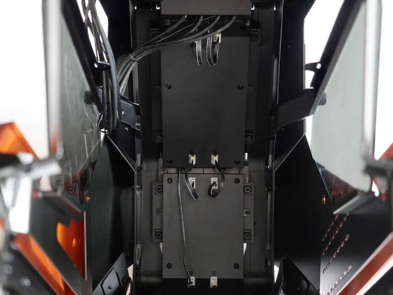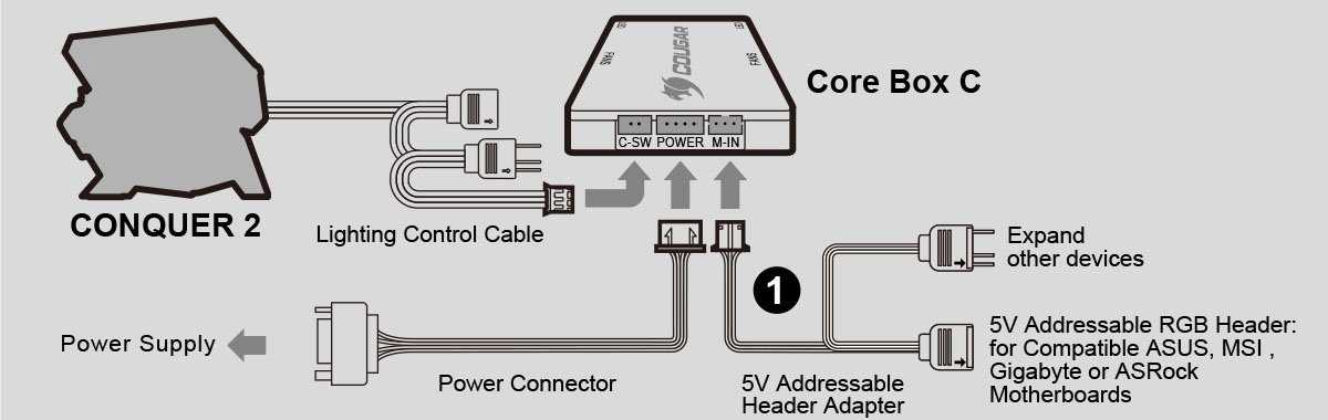 По всей поверхности внутреннего каркаса предусмотрено много отверстий и точек крепления хомутов, чтобы упростить кабель-менеджмент. Комплектный контроллер Cougar Core Box C имеет магнитный подвес, поэтому легко найти ему удобное место. Все излишки проводов отлично прячутся под кожухом блока питания