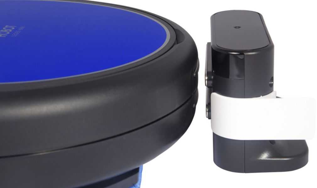Под поднимающейся крышкой расположены емкость для воды или моющего средства, отсек для пылесборника и включатель. По контуру П-образного бампера на пружинистом ходу имеется накладка из резины, которая ослабляет столкновение «умного» помощника со стенами и мебелью.