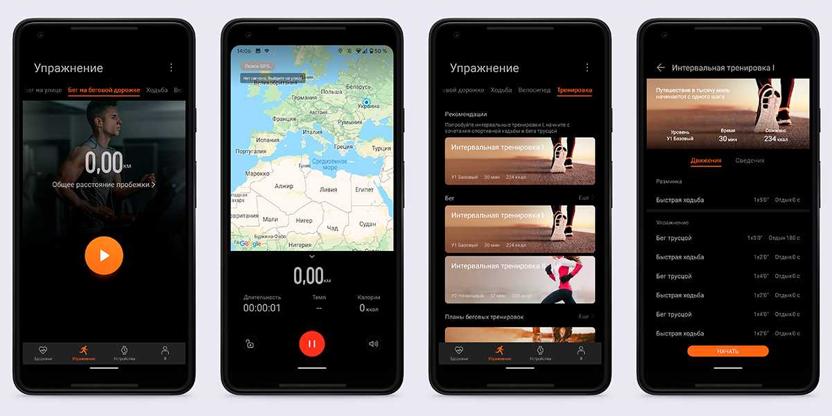 Вторая вкладка с упражнениями позволяет запустить одну из тренировок. Для того чтобы рисовался маршрут на карте — смартфон придется брать с собой. Здесь также есть рекомендации по тренировкам с разными уровнями физической подготовки.