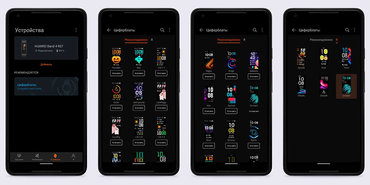 Третья вкладка с подключенными устройствами. Можно перейти к настройке конкретного, а в подменю рекомендаций загрузить и установить новые циферблаты или посмотреть загруженные. Их список регулярно пополняется и сейчас (на время выхода обзора) там есть 60 штук: минималистические, информативные и тематические на любой вкус.