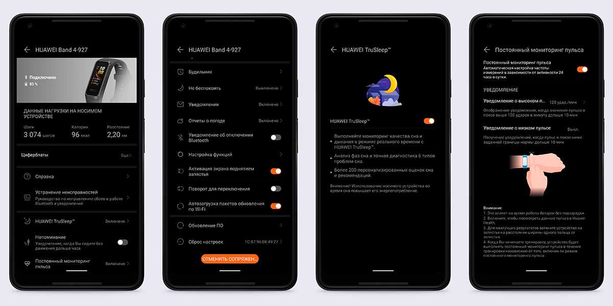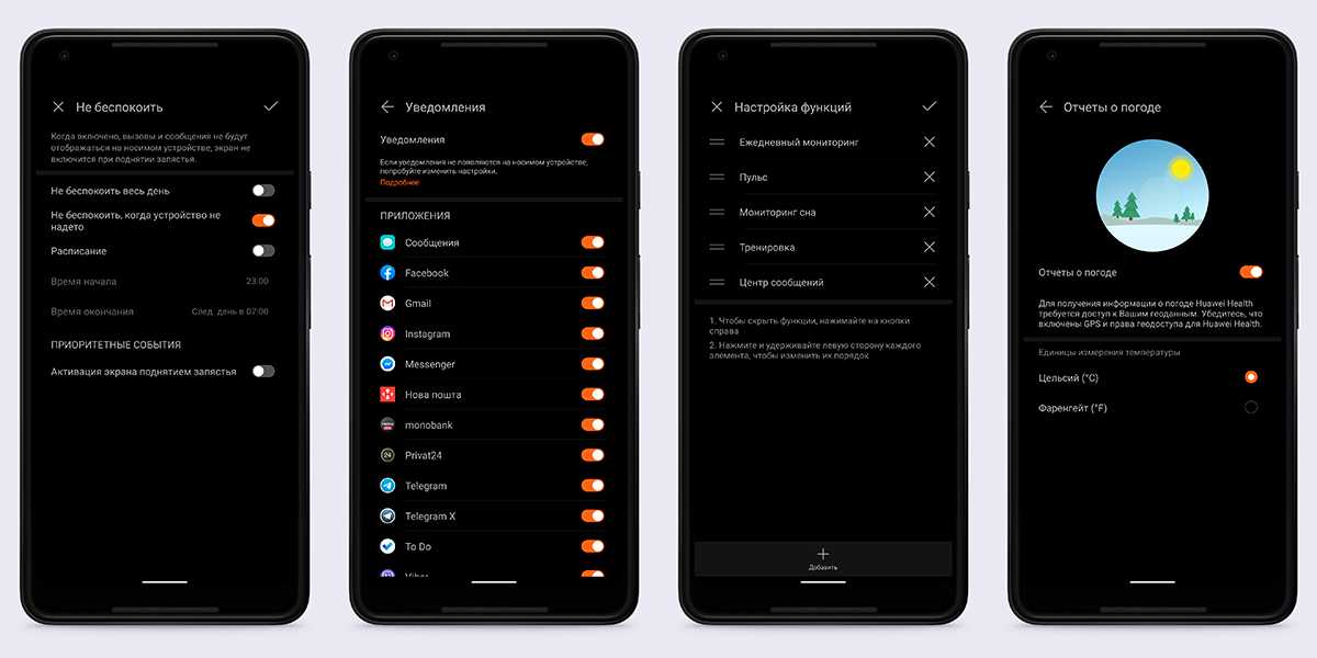 Например, установить время или сценарий работы функции «Не беспокоить», выбрать приложения из которых хотите получать уведомления на браслет, установить порядок пунктов в интерфейсе Huawei Band 4 или скрыть ненужные.