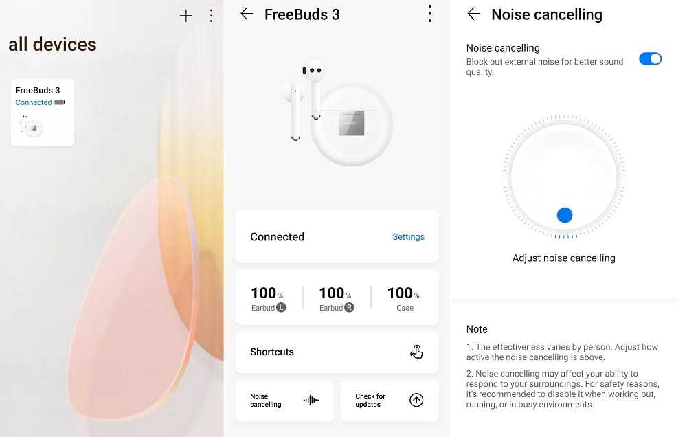 После подключения FreeBuds 3 в программе появляется возможность мониторить состояние аккумулятора и левого, и правого наушника, и кейса раздельно. Рядом находится переключатель шумодава, и колёсико настройки. Я к нему ещё вернусь. Ох как я вернусь.