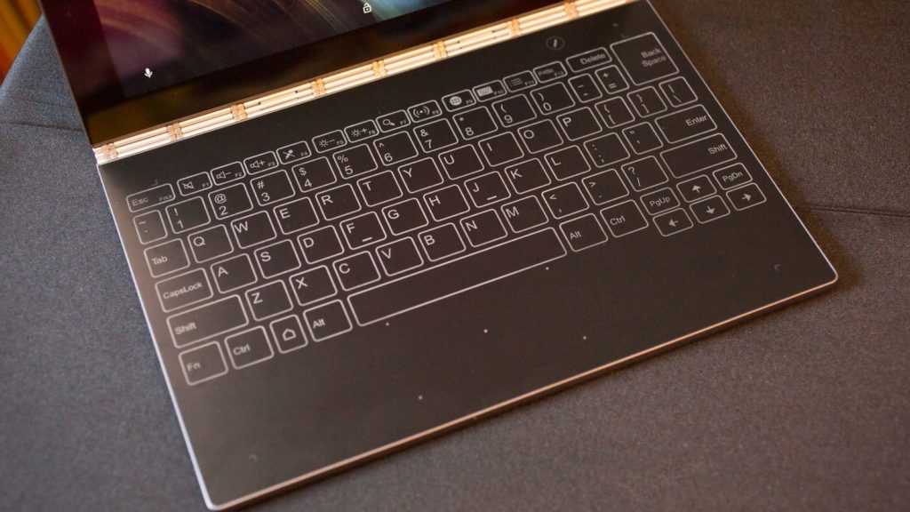 Ключевой особенностью, отличающей Lenovo Yoga Book от аналогичных устройств, является клавиатурная панель. Производитель ее назвал HALO keyboard. Панель сенсорная, изначально она деактивирована и напоминает матовое покрытие. Но когда пользователь начинает с ней работать, включается подсветка и проявляется клавиатура. Присутствует вибрация, имитирующая физическую отдачу от клавиш. Имеется виртуальный тачпад.
