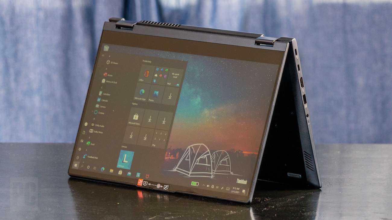 Крышка, подверженная отпечаткам пальцев, имеет двухцветную цветовую схему с большим логотипом ThinkBook. Подняв его, можно увидеть дисплей с разрешением 1920 на 1080 пикселей с тонкой верхней и боковой панелями. (Lenovo утверждает, что соотношение экрана к корпусу составляет 86%.) Скользящая шторка на верхнем крае отключает веб-камеру. Два шарнира позволяют переворачивать и складывать экран обратно в режим планшета, презентационного киоска или палатки с минимальным раскачиванием, если вы коснетесь дисплея в режиме ноутбука. Хотя ThinkBook не прошел тесты на долговечность MIL-STD, проводимые для ThinkPads, почти не будет прогиба, если вы возьмете за углы экрана или нажмете на клавиатуру.
