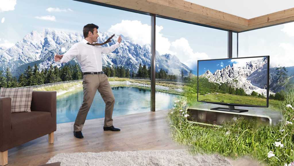 Углы обзора благодаря IPS панели широкие, что существенно увеличивает вариативность размещения телевизора в комнате, позволяя создавать индивидуализированные мультимедиацентры. Частота обновления экрана 50 Гц, что в сочетании с интерполяцией кадров предоставляет плавную картинку высокого качества. Учитывая ограничения панели (отсутствие возможности локального затенения), резкость изображения достигается с помощью покрытия наночастицами и программного улучшения потока.