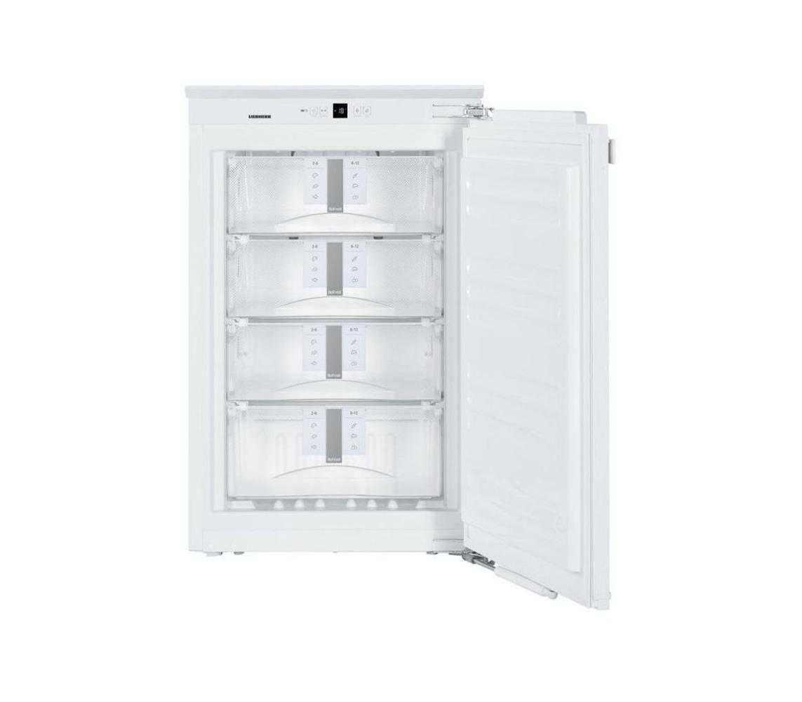 Устройство морозильного шкафа, крепление мебельной двери к его фасаду и ряд функций идентичны SUIG 1514. Отличительной особенностью являются меньшие габариты, за счет чего полезный объем становится равным 73 л, наличие контейнера для льда, системы FrostControl, мебельная вентиляция.