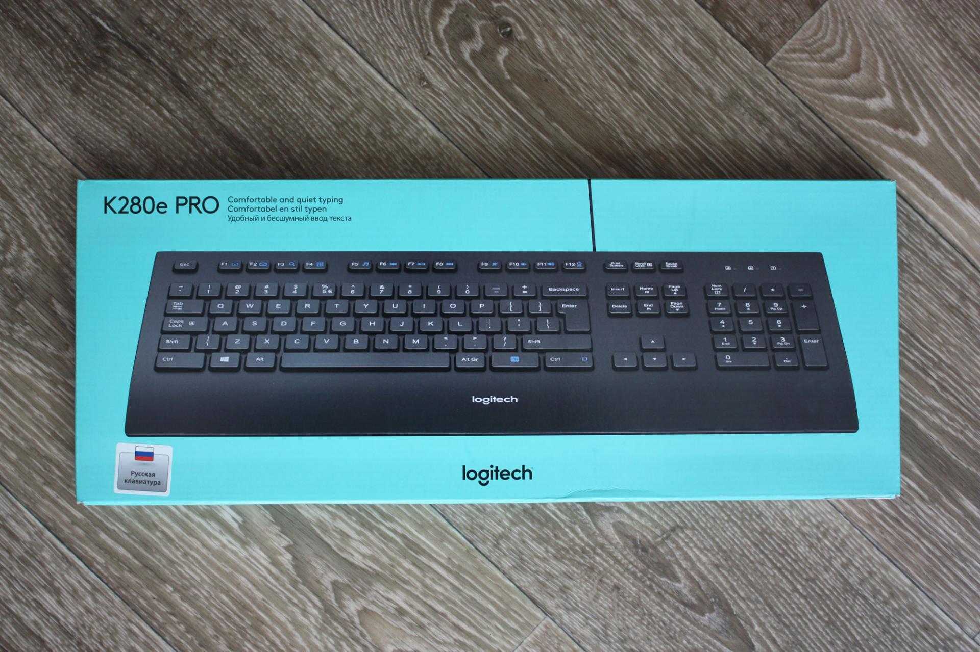 Logitech K280e выпускается под слоганом “Logitech for business” в скромной коробке из обычного картона. Что интересно, в линейке есть очень похожая модель Logitech K290, практически не имеющая внешних отличий от K280e, но продающаяся в обычной упаковке с привычным для Logitech дизайном.