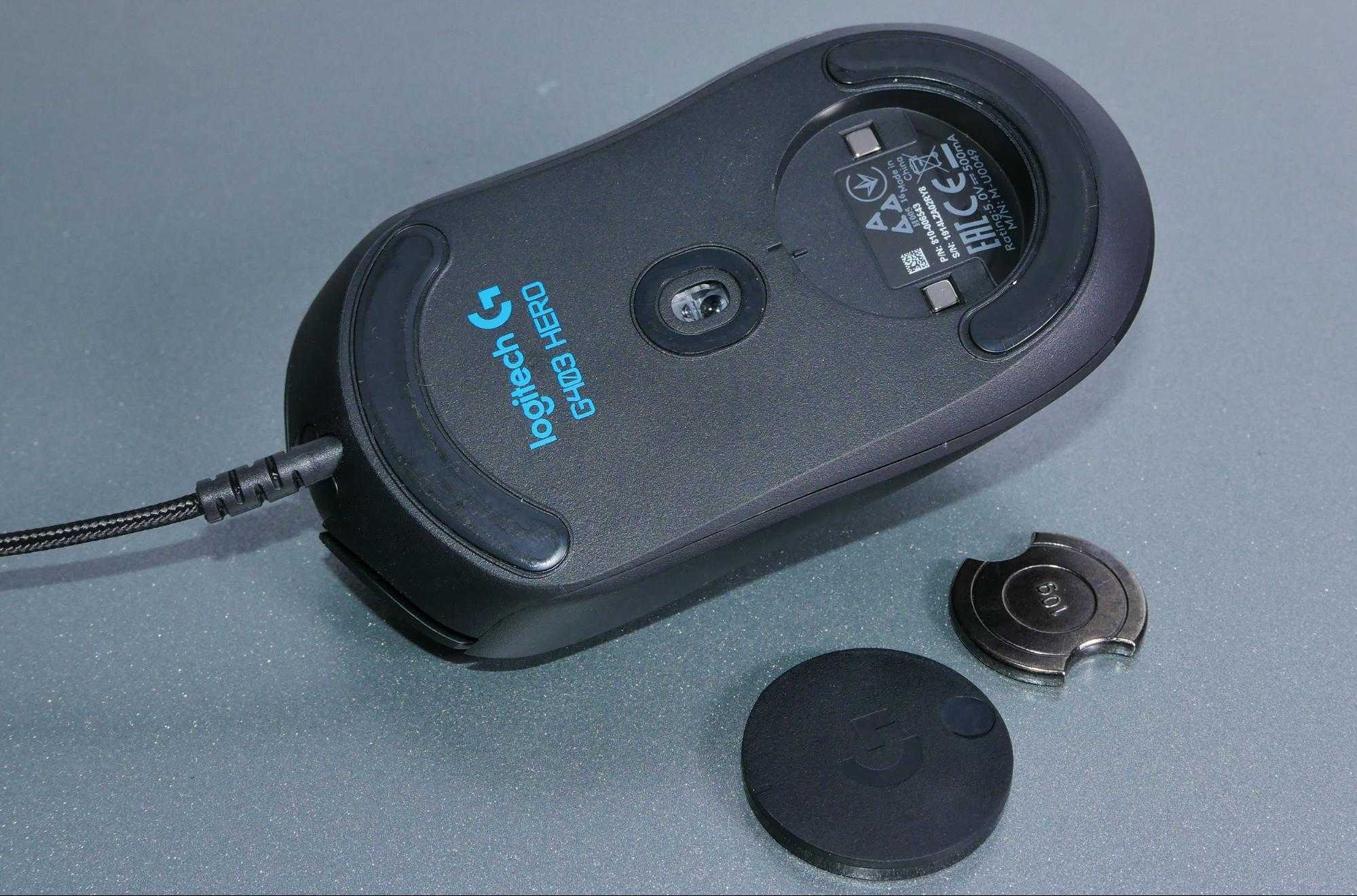 В обзоре G305 я жаловался на отсутствие резиновых вставок по бокам. Ведь сегодня ими оборудованы даже дешевые мышки. К счастью, G403 Hero лишена этого недостатка. Производитель установил резиновые накладки, закрывающие всю боковую часть, естественно, с двух сторон.