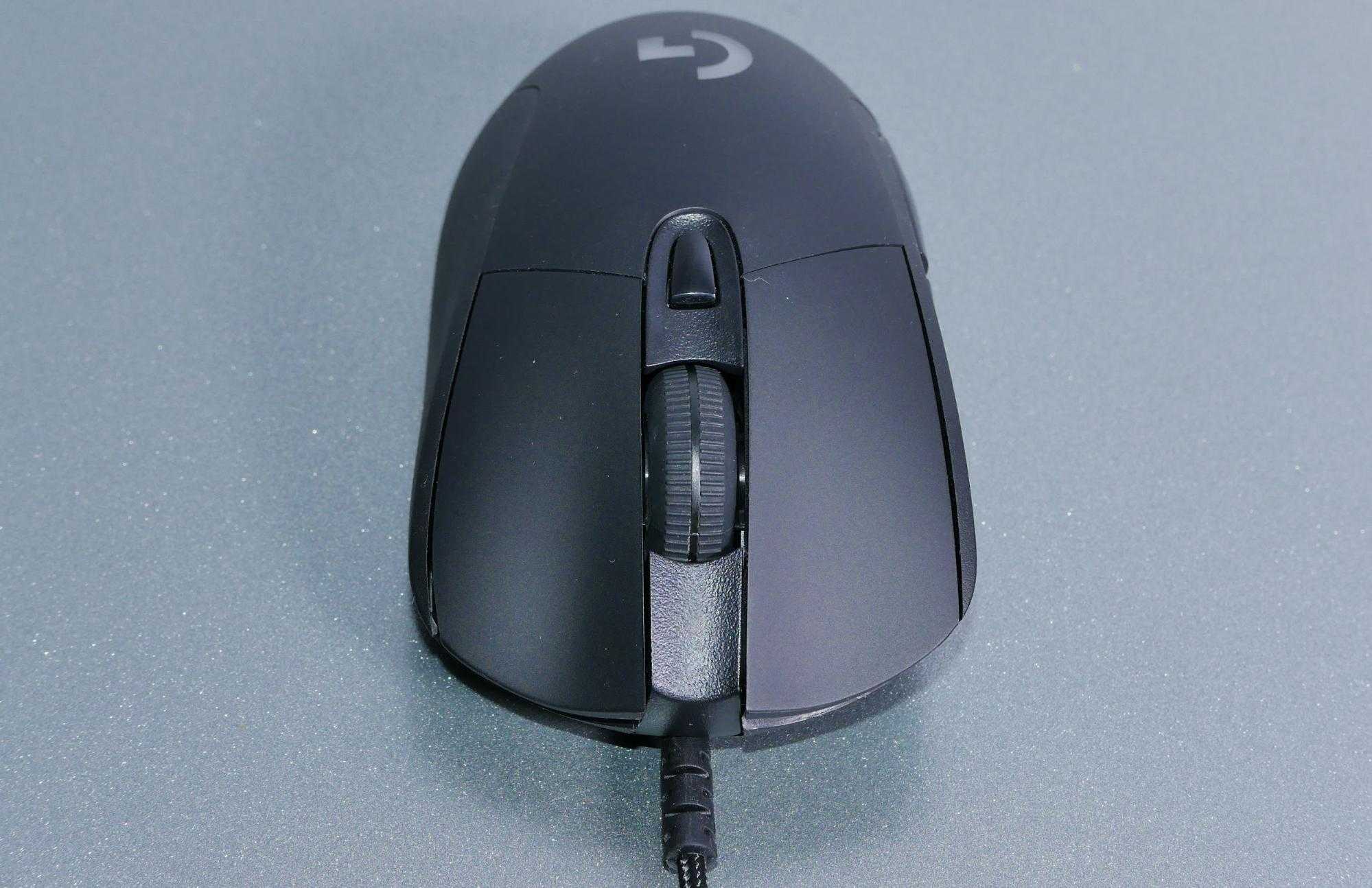 Спереди у мышки хорошо заметен коннектор провода, усиленный резиновой защитой от перегиба. На самой мышке между двумя основными клавишами красуется большое прорезиненное колесо с тонкой полоской подсветки посередине. Очень часто колеса в мышках подсвечиваются по краям с двух сторон, поэтому такое решение от Logitech выделяется из массы и вызывает интерес. Само колесо прокручивается без проблем, у него отчетливые щелчки, ощущается полный контроль. Сразу за колесом расположена кнопка переключения DPI.