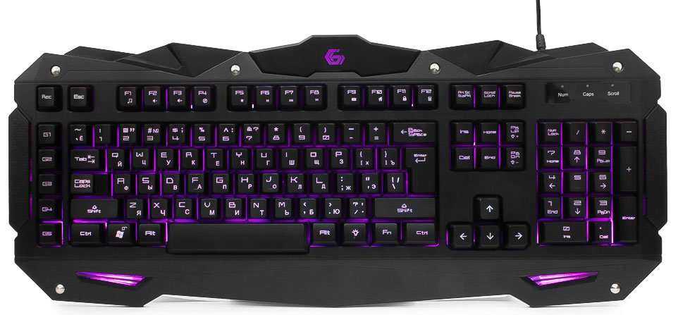 Продолжает наш топ-10 игровых клавиатур мембранная модель Defender Werewolf серии GK-120DL RU RGB с усовершенствованной эргономикой и базовым набором полезных функций для заядлых геймеров. К особенностям девайса необходимо отнести возможность переключения стрелок курсора на клавиши WASD, блокировку системных кнопок ОС, распознавание сразу нескольких нажатых кнопок. Вдобавок, производитель позаботился о наличии хорошей подсветки радужного типа. Угол наклона очень просто контролировать при помощи ножек, аналогично и с яркостью подсветки. Продолжительный срок эксплуатации обусловлен металлическим дном, плетеной структурой кабеля и позолоченным USB-коннектором. Стоит добавить, что конструкция не боится влаги, имеется ферритовый фильтр помех.