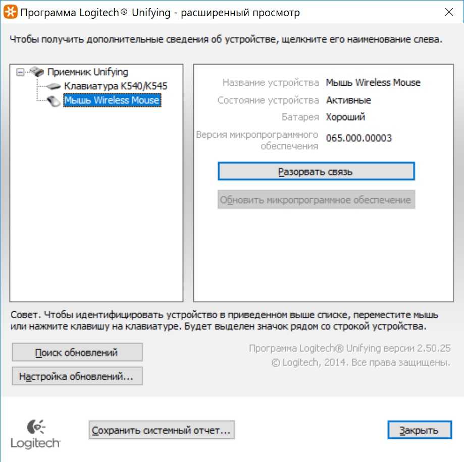 1. Настройки USB-приемника Logitech Unifying. Утилита одноименная. Интерфейс простой и минимальный. Внутри можно увидеть подключенные к приемнику устройства.