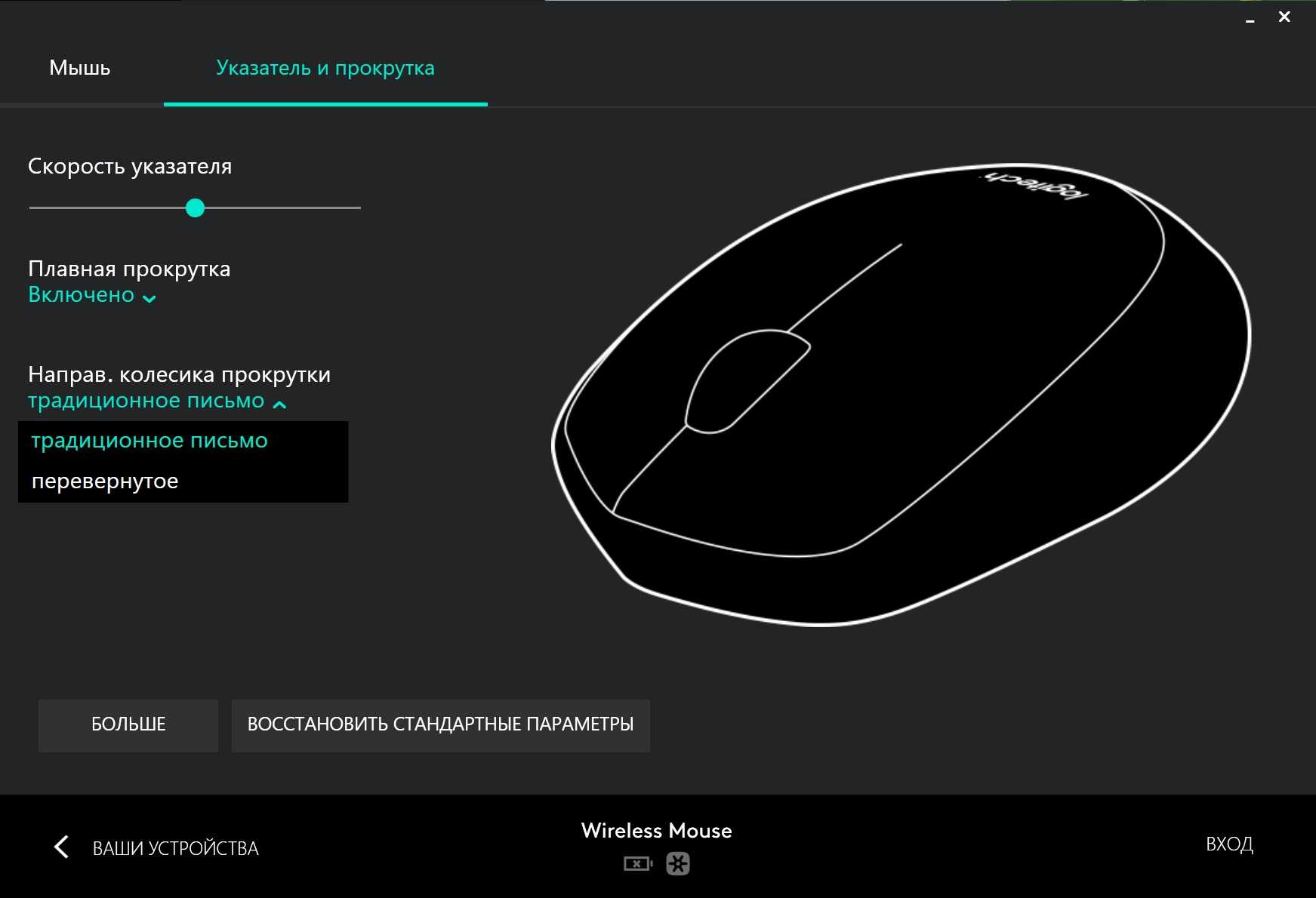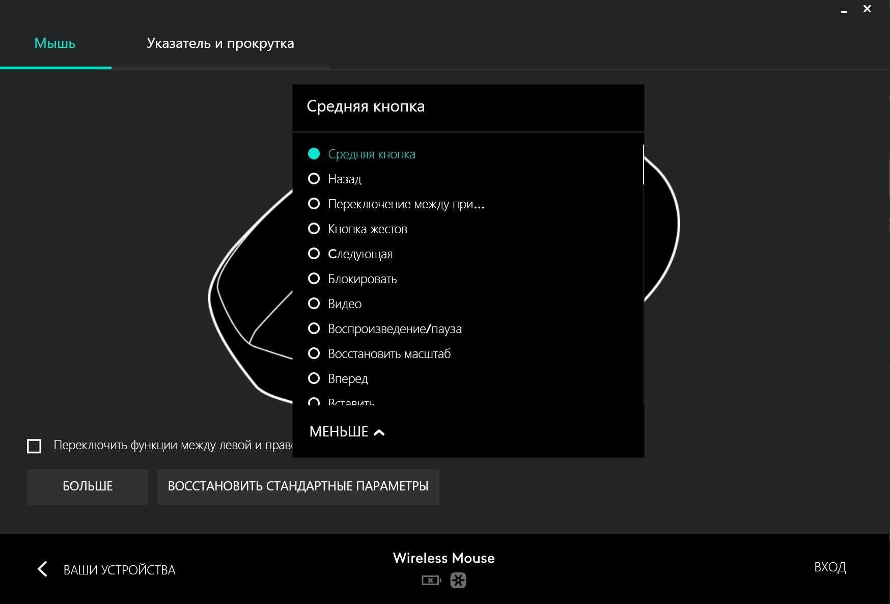 Оптическая мышь Logitech M310. По сути выбор действий тот же, только назначаем действие на среднюю кнопку мыши. Можно настроить скорость колесика прокрутки.