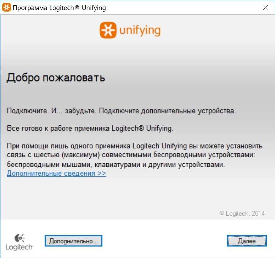 Вместе с комплектом поставляется USB-приемник Logitech Unifying, который может убираться как в корпус клавиатуры, так и в корпус мыши. Особенностью приемника является поддержка работы до 6-и устройств и это настраивается с помощью одноименной утилиты. В нашем случае он настроен на работу с двумя устройствами (клавиатура, мышь).