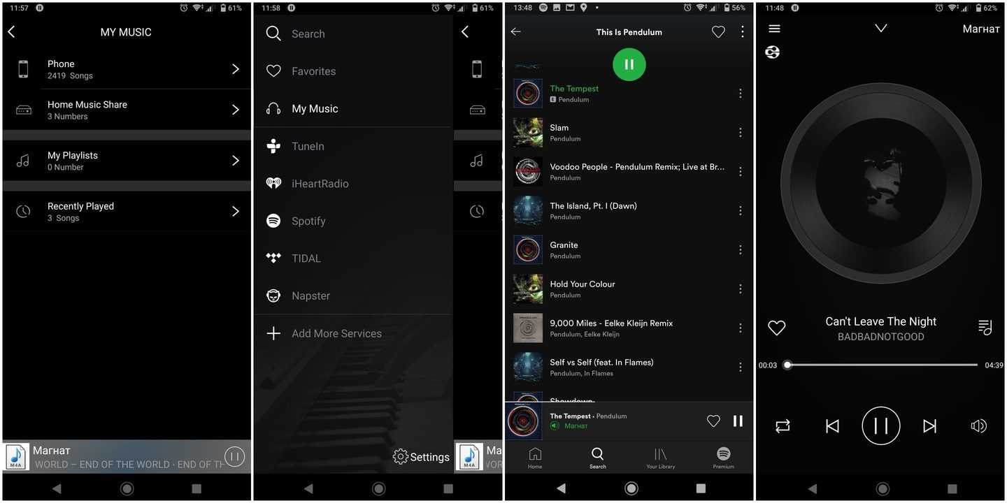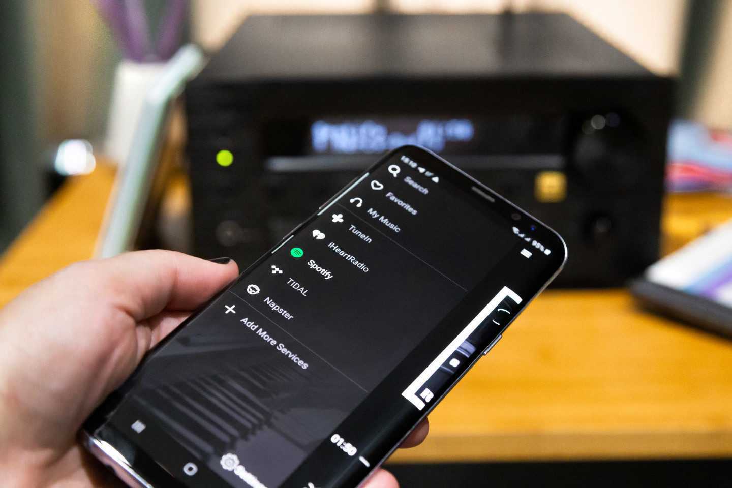 В меню доступны поиск по библиотеке, избранное, «Моя музыка», а в отдельном блоке размещены кнопки сетевых сервисов. Всего их доступно пять: интернет-радио в формате TuneIn и IHeartRadio, Spotify с Tidal и даже Napster, который, можно сказать, является отцом современного стриминга.