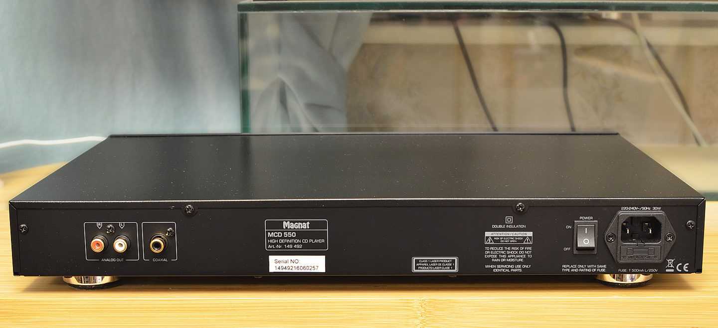 Переходим ко второму герою нашего повествования — совершенно новому CD-проигрывателю MCD 550. Корпус по конструкции повторяет MA 400, разве что чуть компактнее и меньше весит. Дисплей самый простой, однострочный. Magnat указывает, что используется лазер фирмы Sanyo, а по спецификации видно, что привод универсальный — читает и CD, и CD-R/RW, и MP3. Внутри, вопреки моим опасениям, солидных размеров материнская плата, экранированный (!) блок питания с Ш-образным трансформатором. Для бюджетного сегмента все очень даже прилично.