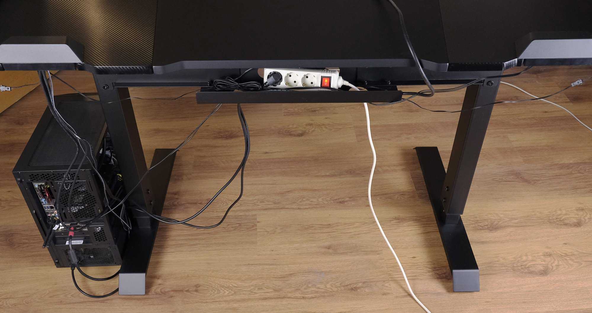 Также сзади имеется корзина, в которой можно как разместить лишнюю длину кабелей, так и достаточно крупный сетевой фильтр. Правда находится она по центру, а системный блок по умолчанию будет стоять где-то рядом с ножкой стола, так что кабели всё равно придётся тянуть до неё, и их будет хотя бы частично видно. Жаль, что нет полноценного кабель-канала из профиля во всю ширину стола.