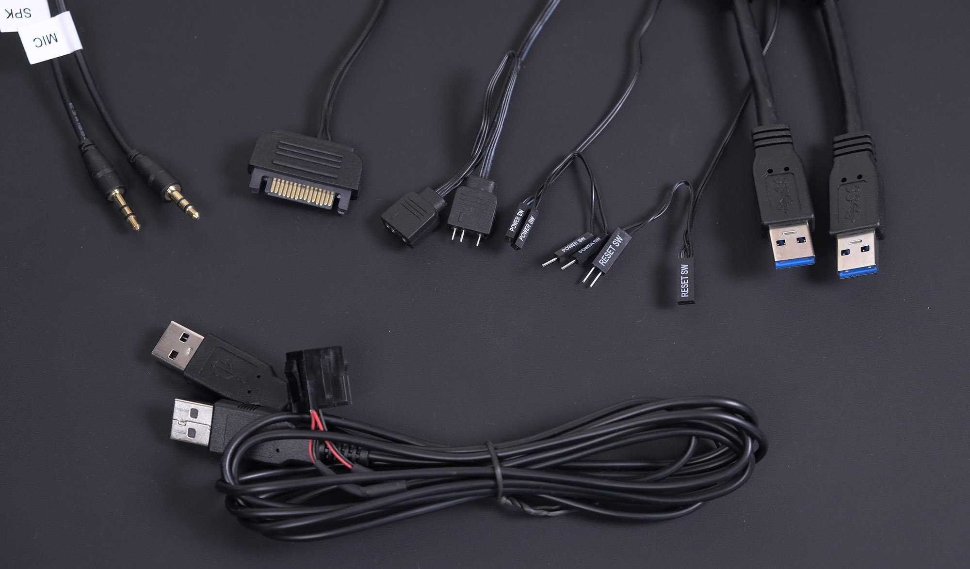 Разъёмы USB 3.0 раздельные, каждый подключается по отдельному проводу к системному блоку. Также продумано и подключение кабелей управления к материнской плате – для этого предусмотрена планка в слот расширения на заднюю стенку корпуса.