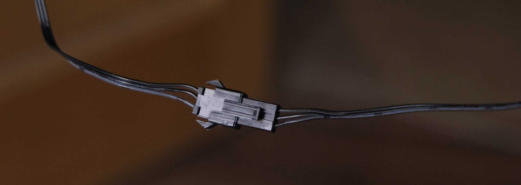 Подсветка боковин подключается кабелями с коннекторами под столешницей, и они провисают в воздухе, так как длина проводов оставлена с запасом, хотя не очень ясно, для чего. Зацепить их тоже не за что – фиксатор на 3М скотче в комплекте только один.