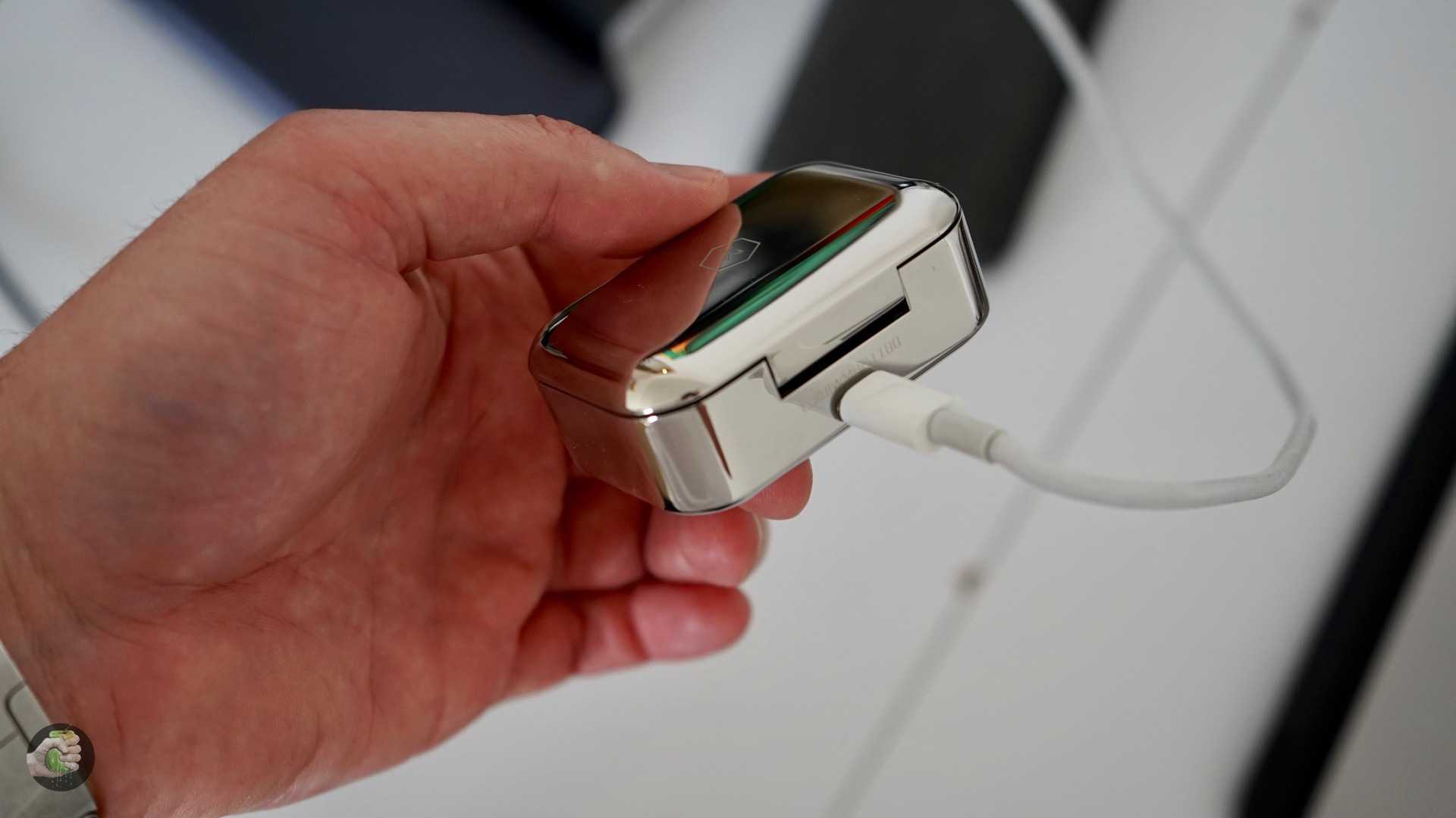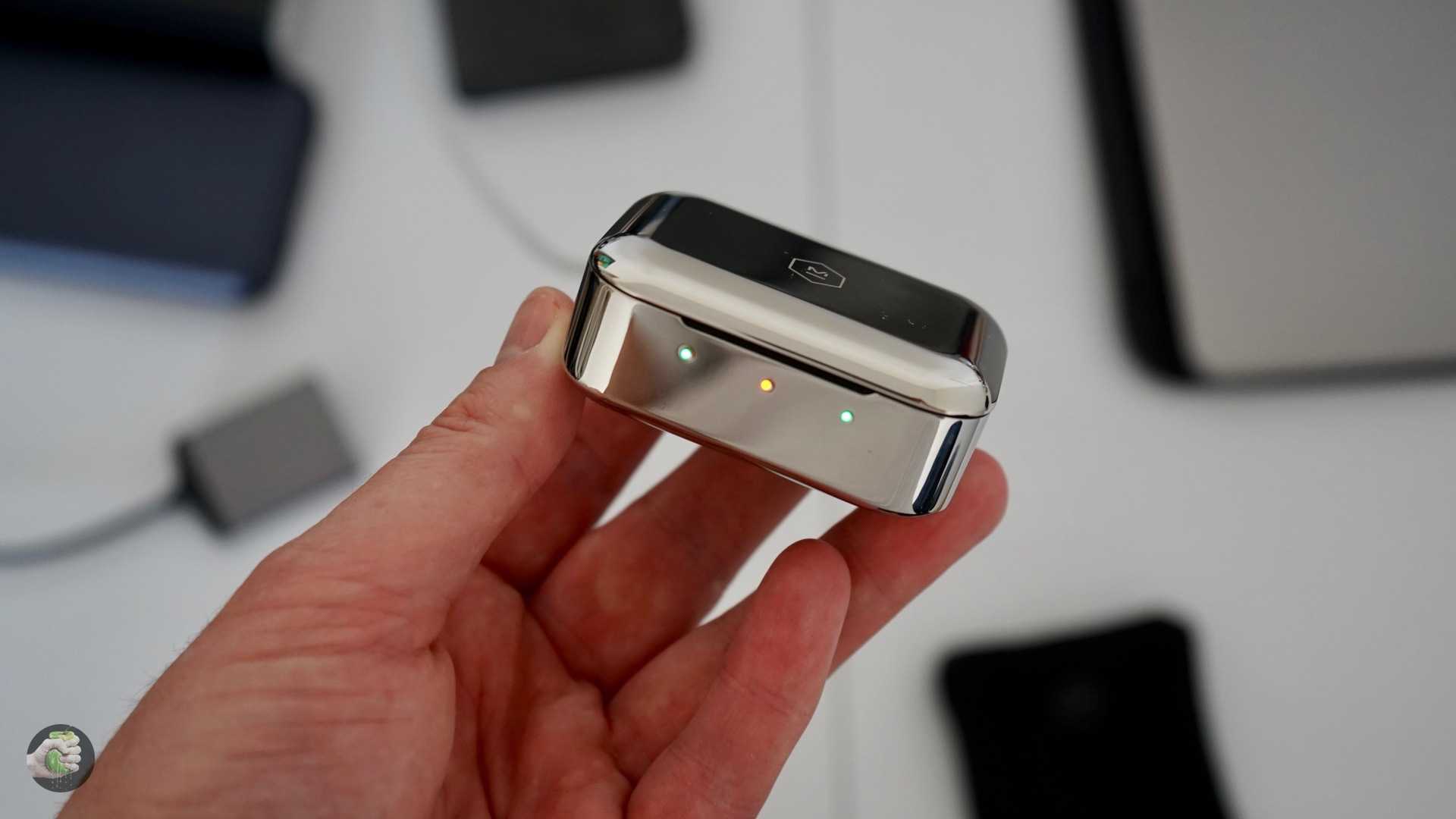 Индикаторы состояния на передней панели зарядного футляра показывают, сколько батареи осталось в футляре и каждом наушнике, а порт USB-C на боковой панели подключается к прилагаемому зарядному кабелю. Master & Dynamic включает в себя переходник кабеля USB-C-USB-A для тех, у кого нет доступа к порту зарядки USB-C.