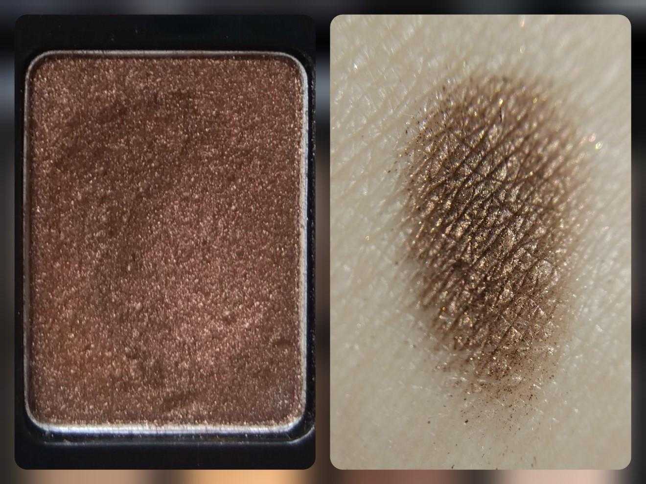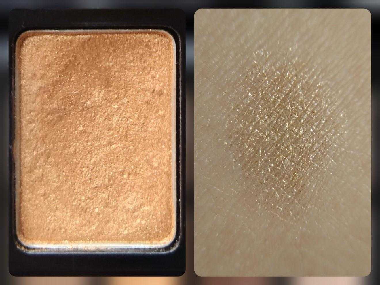 - холодный темно-коричневый с золотисто-зеленым крупным шиммером — держится долго и сохраняет яркость, даже если сочетать с другими тенями и растушевать;