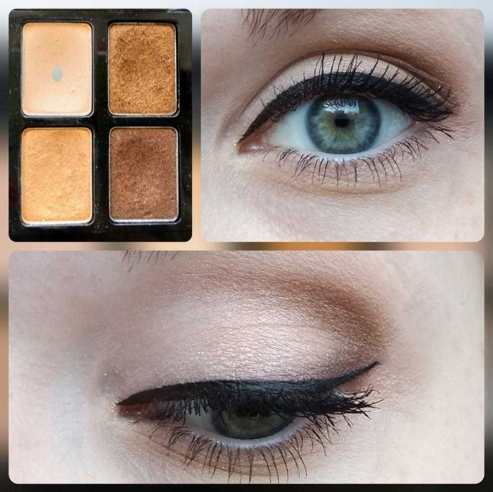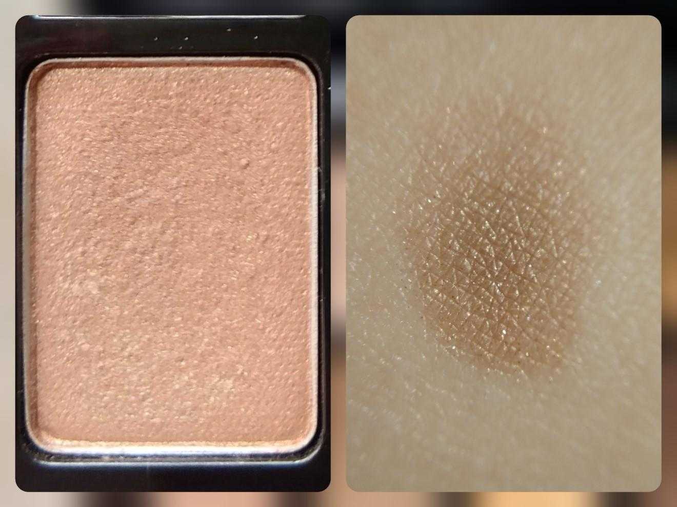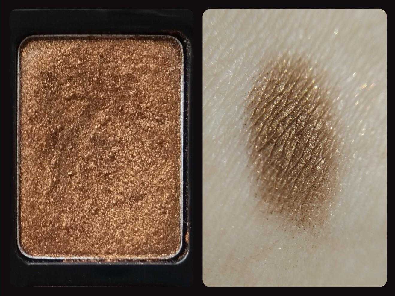 - насыщенный бронзовый с блеском — подойдет, чтобы выделить складку и внешний угол глаза, легко растушевывается, в небольших количествах подойдет для дня, в больших – для вечера;