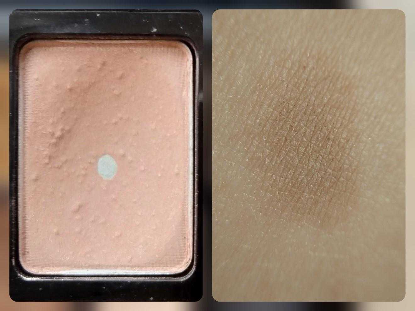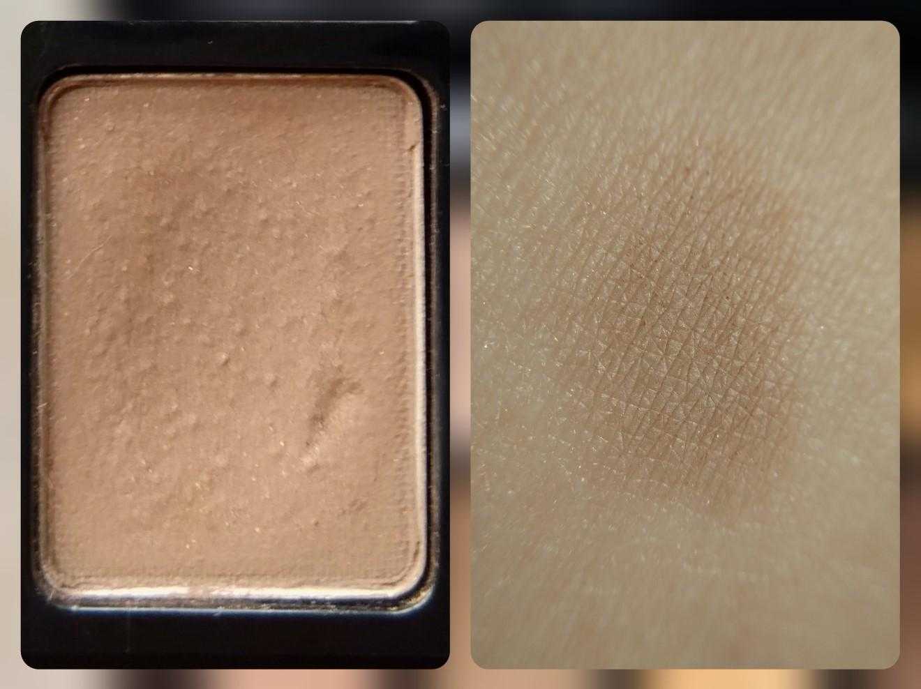Оттенок #2 с полуматовым сатиновым эффектом даёт неяркое покрытие цвета кофе с молоком, который почти совпадает с оттенком кожи, хорошо растушевывается с другими тенями из своей гаммы. Текстура очень бархатистая.