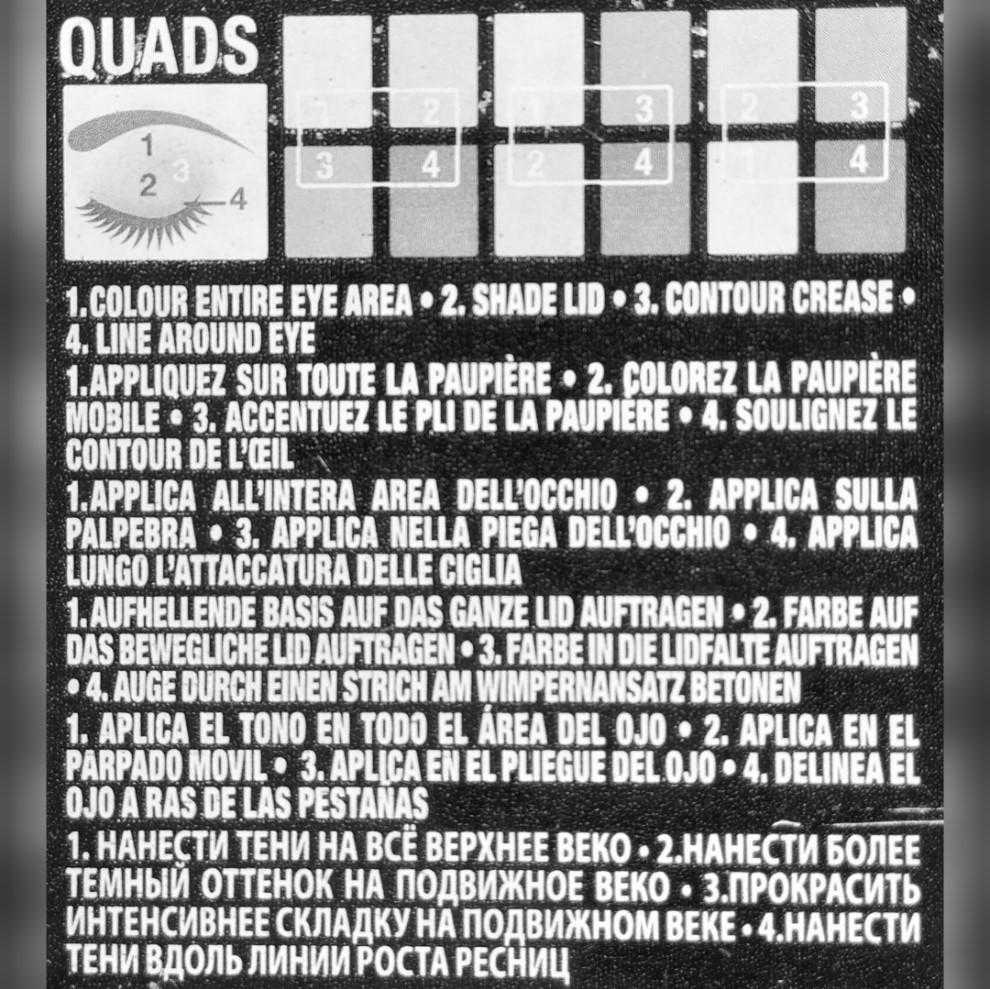 Для меня как для начинающего визажиста-самоучки интересно получить какую-либо информацию о сочетании оттенков, способах нанесения. Особенно приятно, когда производитель на обратной стороне коробочки с тенями разместил свои рекомендации по созданию макияжа с помощью четвёрок, троек и пар оттенков. Также удобно то, что оттенки заботливо пронумерованы — не приходится угадывать, остаётся лишь наложить тени на нужные области век.