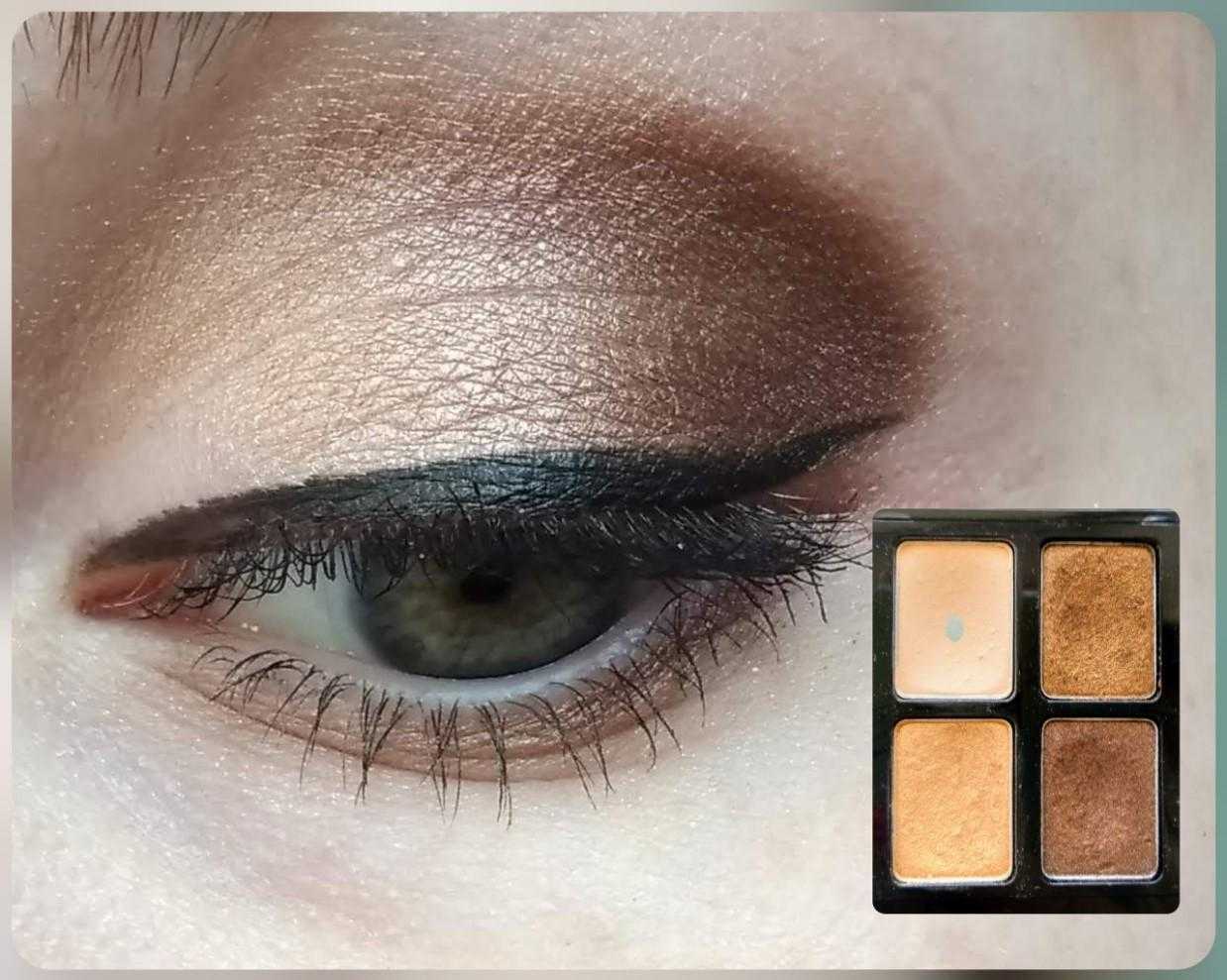 - «Шиммерным золотом» покрыть подвижное веко, «корицей» прорисовать складку, внешний угол и нижнее веко. Образ называется «мисс очарование» и получается золотым, сияющим и при этом нежным.