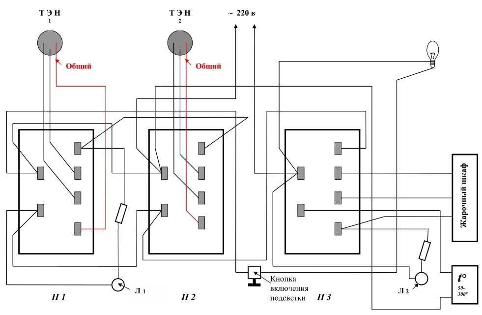 В третьем положении переключателя S1 замкнутся контакты Р1-1, Р2-2, что приведёт к подключению к сети только параллельно соединённых ТЭН Е4 и Е5. Выключатель S4 используется для включения лампы HL3 подсветки жарочного шкафа.