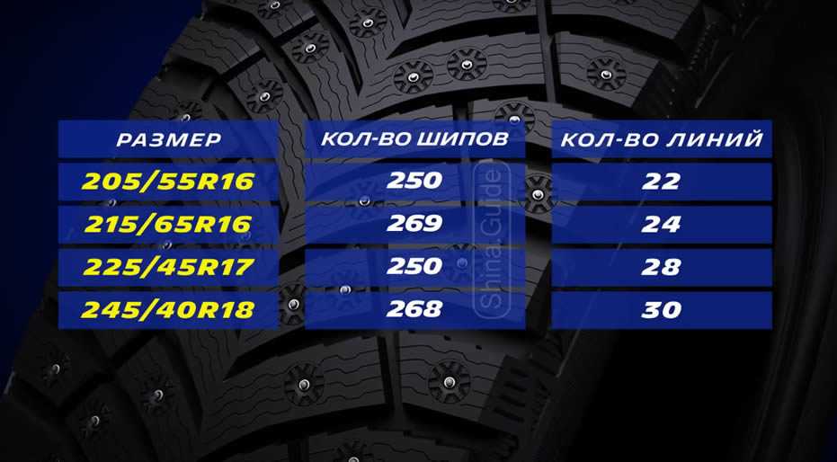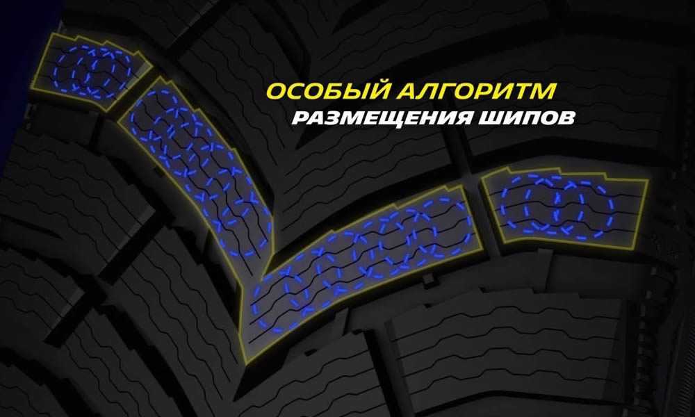 - Особый алгоритм размещения шипов для оптимального сцепления и комфортного уровня шума