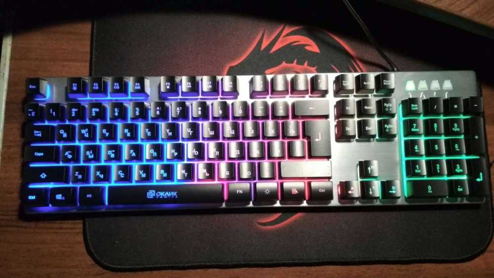 Весь периметр аксессуара освещается разными цветами. Можно менять режим свечения и управлять яркостью. При наборе клавиши нажимаются мягко и сравнительно тихо. Есть много мультимедийных кнопок, блокировка клавиш от детей, а также возможность изменить задачи отдельных кнопок.