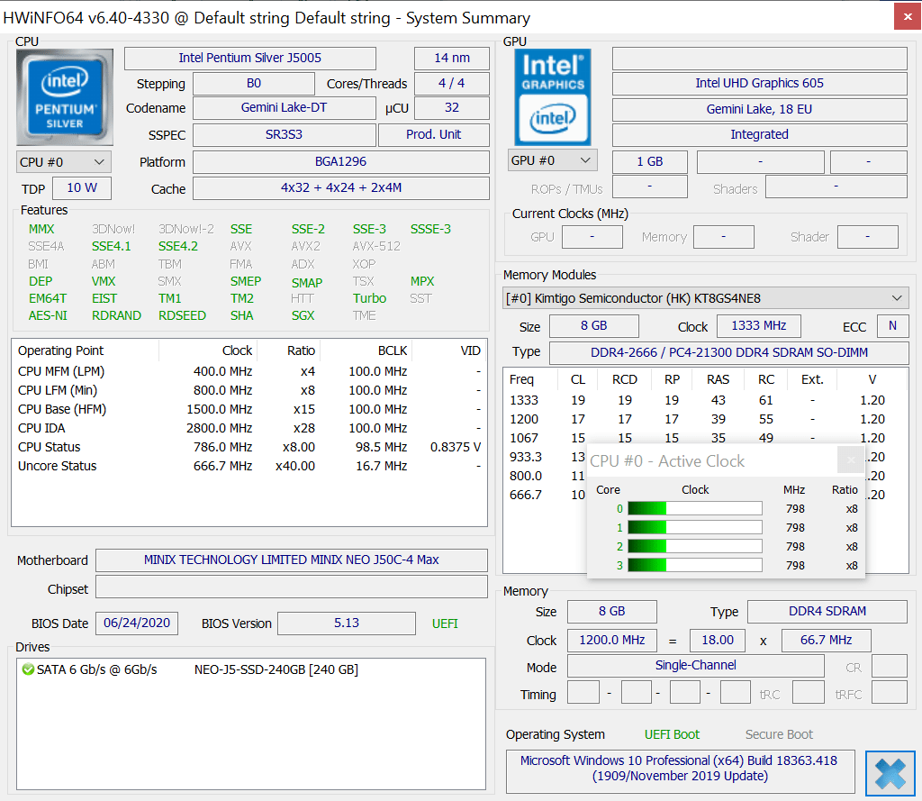В программе HWinfo64 показана та же информацию, что и у прошлой модели, за исключением SSD-накопителя на 240 Гб и 8 Гб оперативной памяти, которая поддерживает частоту до 1333 МГц, хотя, похоже, она настроена для работы на частоте 1200 МГц. В мини-ПК установлен один модуль ОЗУ объемом 8 ГБ, поэтому режим двухканальной памяти не включен, но есть возможность расширения до 16 Гб, просто установив дополнительный модуль памяти еще на 8 Гб.