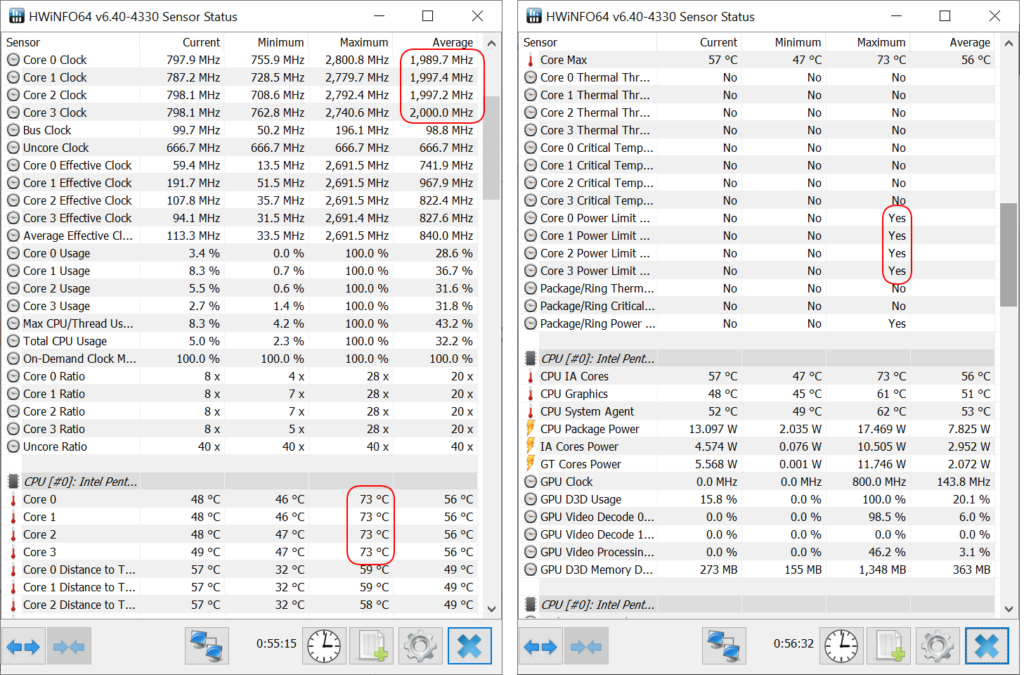 В программе HWiNFO64 показано, что максимальная частота составляет около 2,8 ГГц, что соответствует спецификациям, и не было никакого троттлинга процессора при максимальной температуре 73°C, но все ядра процессора достигли своего предела мощности.