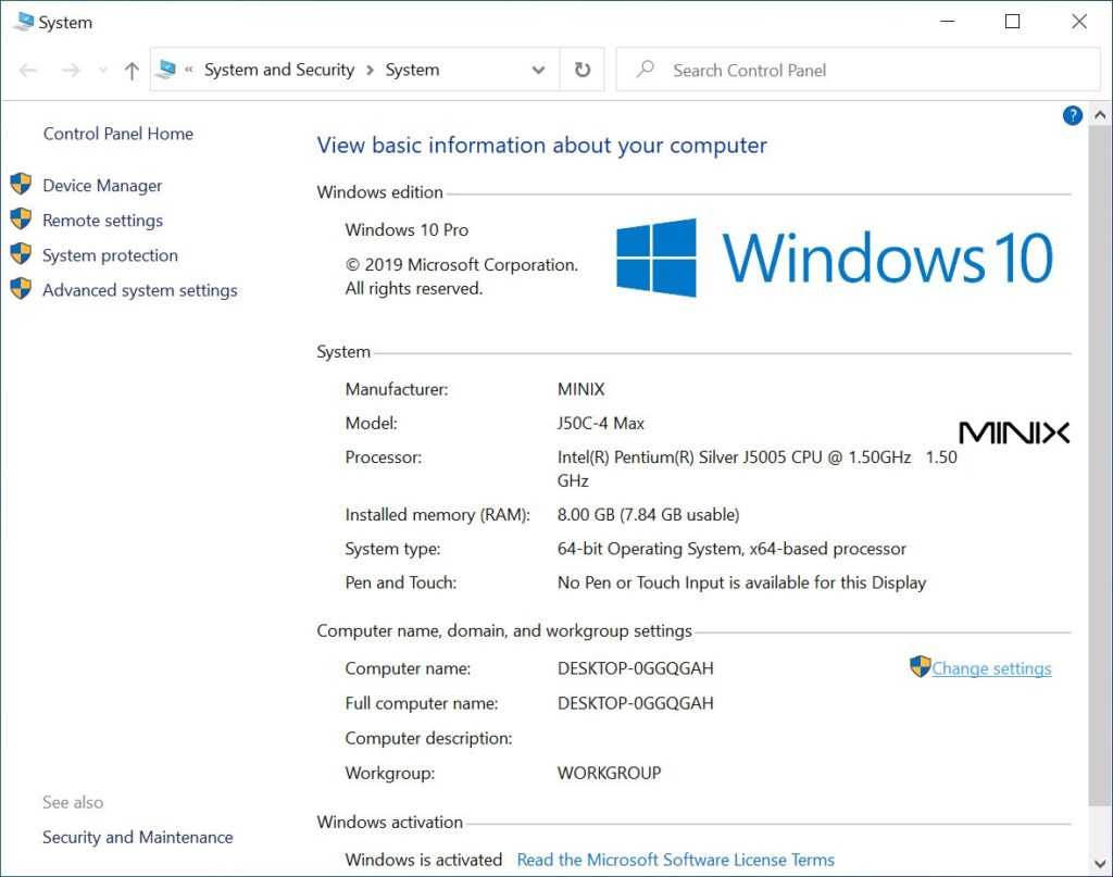 Мини-ПК работает под управлением 64-битной Windows 10 Pro, за исключением того, что объем оперативной памяти теперь составляет 8 Гб.