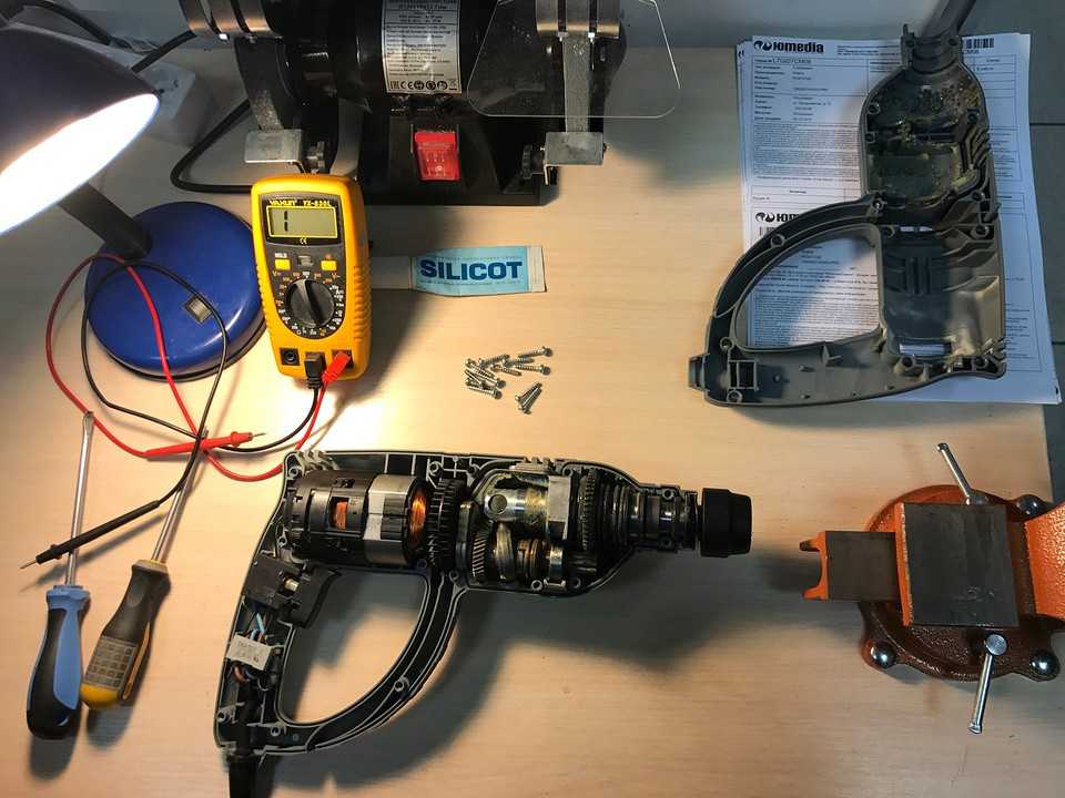 Шуруповерт оборудован двигателем, помещенным в специальный корпус. Там же расположены якорь и щетки. Чтобы проверить состояние двигателя, нужно отсоединить провода, идущие к кнопке пуска. Сопротивление обмотки на якоре измеряется мультиметром. При низком значении прибор покажет короткое замыкание. Если значение отсутствует, значит где-то произошел в токоведущем проводе. Если вышел из строя якорь, то пропадает мощность шуруповерта и появляются искры при работе. Это может сопровождаться задымлением и полным отключением агрегата.