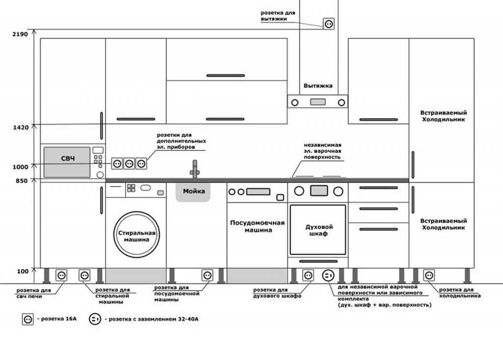 Кроме того, расстояние от духовки до стены будет довольно большим. Размещать точки питания ниже 30 см от пола также не следует, хотя нередко розетки устанавливают на нижних опорах мебельного гарнитура. Это вынужденный и небезопасный вариант, поскольку иначе разместить розетки просто негде, мешает плотно установленная мебель.