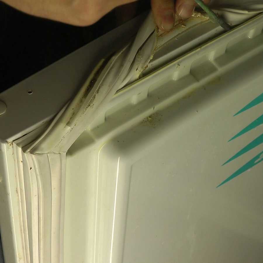Резинка, установленная на дверце холодильника, в процессе эксплуатации агрегата теряет эластичность и растрескивается. В результате нарушается герметичность холодильного отделения, внутрь поступает теплый воздух, компрессор начинает усиленно работать и на задней стенке образуется наледь. Для восстановления температурного баланса требуется замена дверного уплотнителя.
