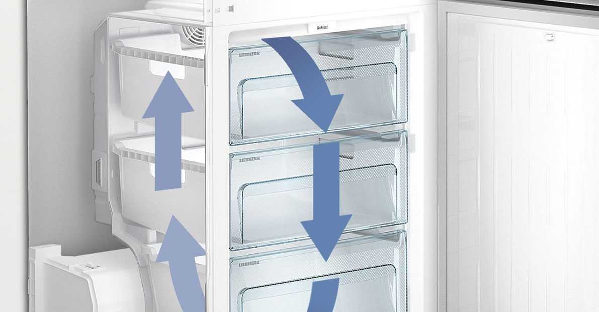 Теперь что такое No Frost в холодильнике и в чем отличие от капельной системы. Несколько вентиляторов, разносят холодный воздух по всем участкам камер. Температурный режим выравнивается во всех углах и продукты охлаждаются равномерно. Воздух, с небольшим количеством влаги, выходит за стенки и остается на испарителе.
