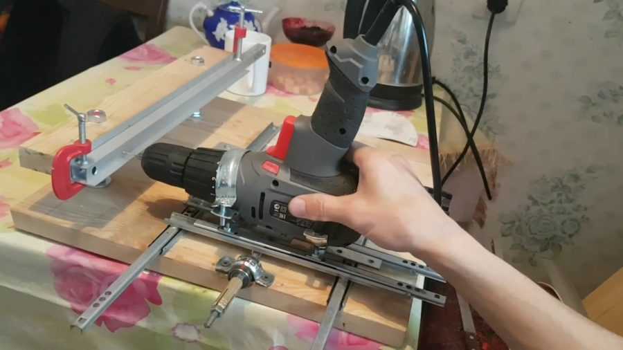На стойке хомутом закрепить шуруповерт. При этом между его патроном и стойкой нужно оставить небольшой зазор (2-3 мм). В патроне закрепить фрезу.